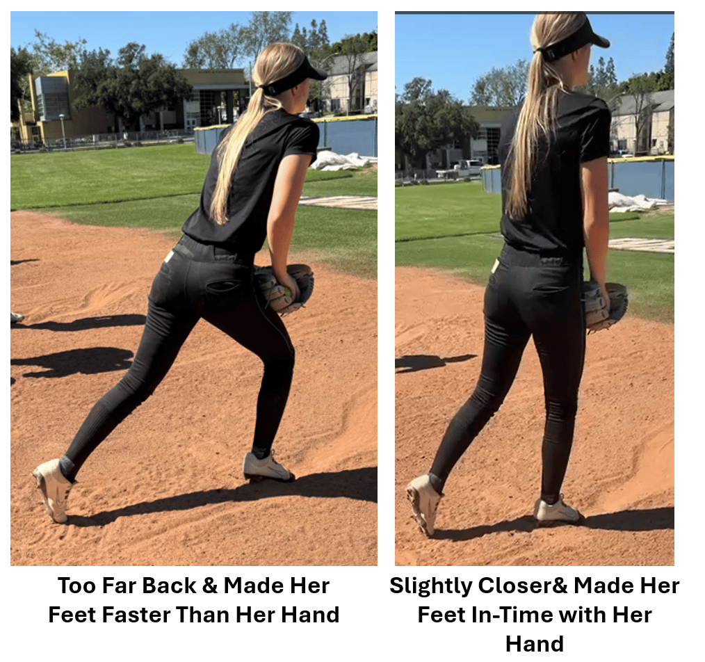 Without the legs - or the ground-push connecting to the pitcher’s hand, the pitcher’s feet get way ahead of their hand so the pitcher will complain of feeling “out of time”. Or, “I feel off time”. And she’s right, she is off time. In other words, her feet are way faster than her hand.