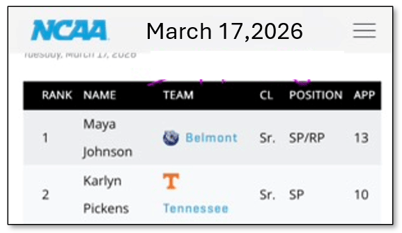 Two names that are at the top of the current ERA list from the NCAA are Maya Johnson (Belmont) and Karlyn Pickens (Tennessee) - both with miniscule ERA’s.