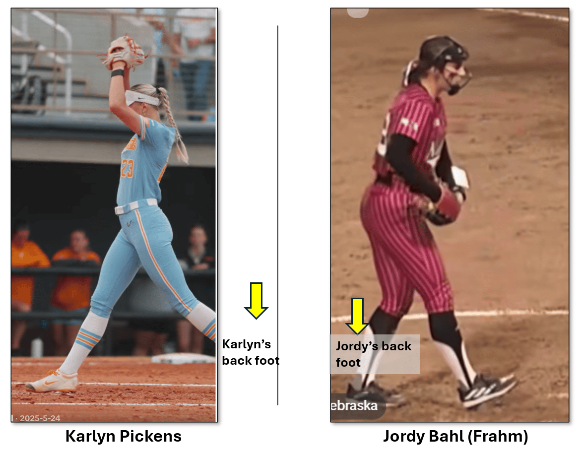 Pickens places her back foot really far behind the rubber and Bahl (Frahm) has hers fairly close to the rubber. Each pitcher is definitely on-time and on-power with their motion so their foot placement obviously works for them.
