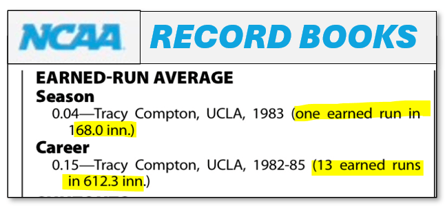 BUT…a long time friend of mine, who my sister caught for back-in-the-day, Tracy Compton, holds the mind-blowing NCAA Record for Season and Career Earned Runs Allowed: