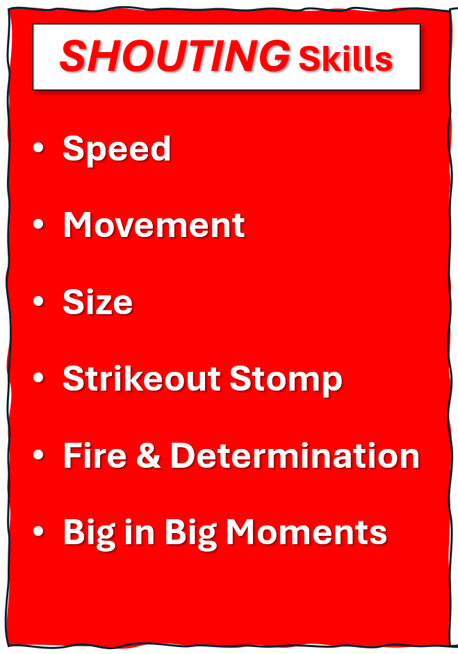 Let’s start with the SHOUTING SKILLS, because they’re the easy and obvious ones. These are the skills you can see on TV or from the stands. Shouting skills are just that, the loud and the obvious skills that all players have, and pitchers in particular because they’re so obvious.