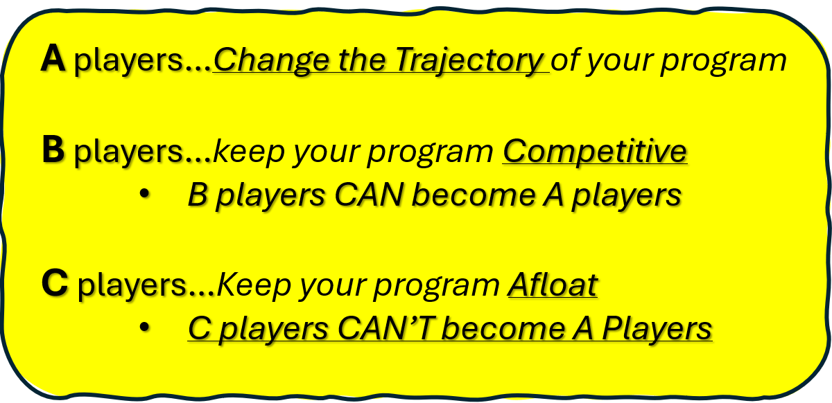 You don’t have time to make these changes. Be objective with your B’s. Create specific qualities that you can measure so you’re more likely to recruit the highest level B player you can find. C players keep you where you are, B players make you competitive and A players change your program.