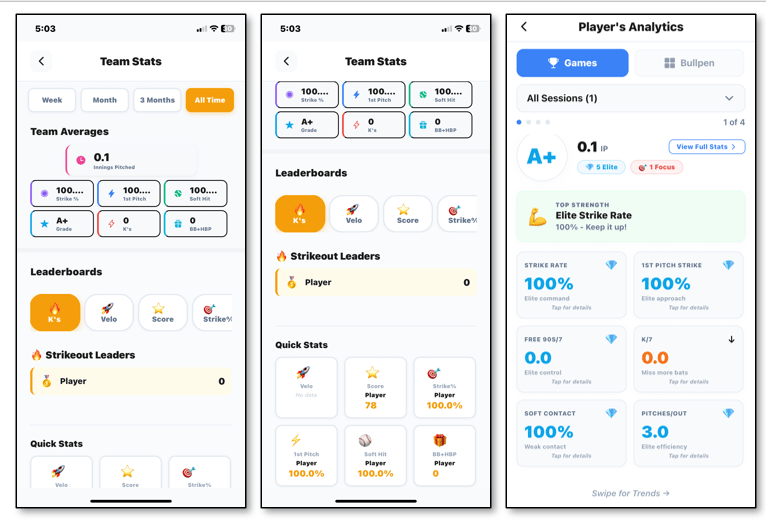 All the data is displayed in easy-to-read visuals including leaderboards and staff averages The data includes the following, per pitch: